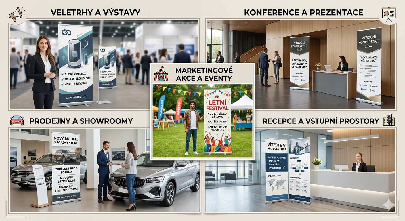 Roll-up bannery jsou oblíbené především díky své mobilitě a flexibilitě. Grafiku lze v mnoha systémech vyměnit, takže jeden stojan můžete používat pro různé kampaně nebo akce. :contentReference[oaicite:2]{index=2}